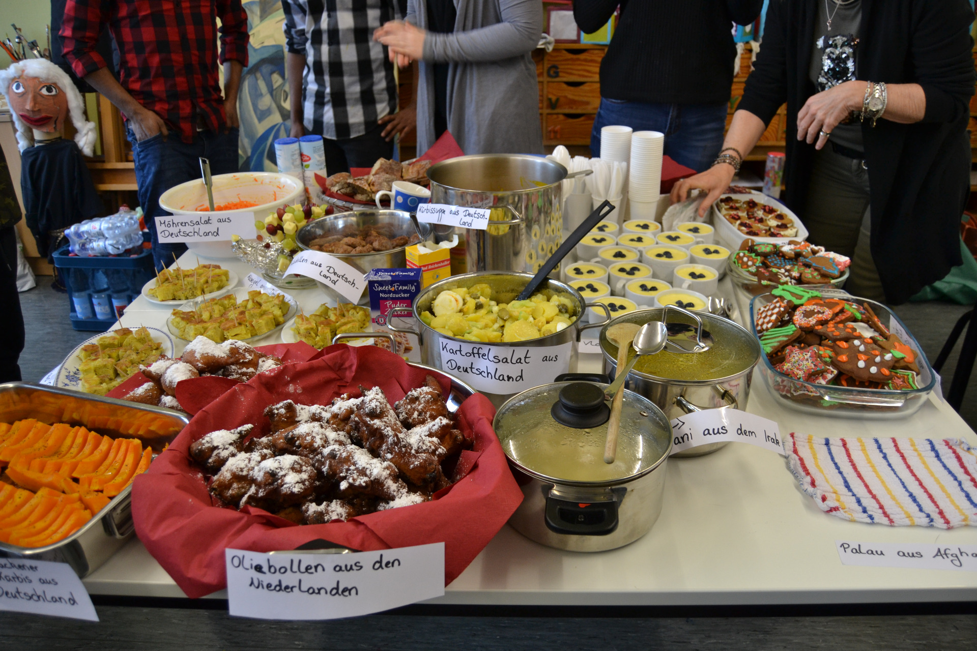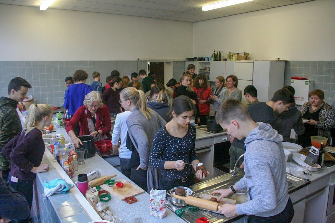 Thursday was our big day. We started a little later than on Wednesday to avoid finishing earlier than planned again. Every group started with preparing the ingredients and tools required for their meals so they could start cooking. Everyone put a lot of effort into their work and even the Estonian headmistress passionately supported her group of students preparing traditional cookies. It was especially hard for the Spanish girls to cook their tortillas but with the help of their German teacher even that task could be mastered. In the end an impressive buffet of intercultural meals from Germany, Estonia, Spain, the Netherlands, Iraq, Bangladesh and Afghanistan was the result everyone had worked for the last days and this morning in particular. Nobody expected such a colourful and delicious-looking outcome so the astonishment and pride felt by all students and teachers was nearly visible. Maybe that's why the opening of the buffet had a kind of rough start because nobody wanted to destroy that beautiful collection of various meals everyone had worked for so passionately. Eventually someone had to start and after the first plate was filled with all kinds of food many more followed. When everybody had enough it was time to award each participant with their certificate for the week. That little ceremony was followed by a cleaning session as the mess of our work had to be erased. That task was fulfilled rather quickly so everyone was happy to spend the afternoon with their exchange student.